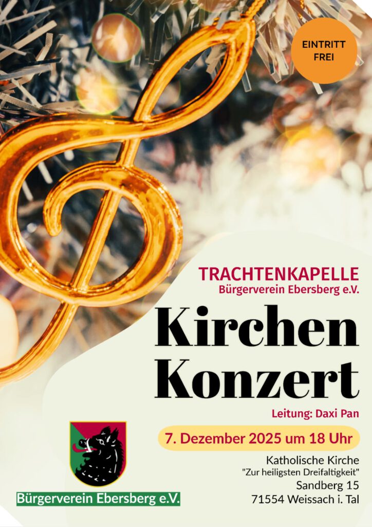 Das Konzert findet am Sonntag, den 07. Dezember 2025 um 18:00 Uhr in der katholischen Kirche „Zur heiligen Dreifaltigkeit“ in Unterweissach (Sandberg 15 / 71554 Weissach i.Tal) statt.